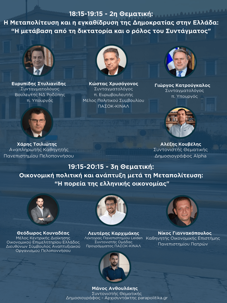 Το συνέδριο, με θέμα «50 Χρόνια Μεταπολίτευση 1974-2024», φιλοδοξεί να αποτελέσει ένα σημείο αναφοράς για τον δημόσιο διάλογο, προσεγγίζοντας καίρια ζητήματα της ελληνικής πολιτικής, οικονομικής και κοινωνικής ιστορίας. Εξαίρετοι ακαδημαϊκοί, εκπρόσωποι της πολιτικής σκηνής και δημοσιογράφοι ενώνουν τις δυνάμεις τους σε έναν γόνιμο διάλογο, φωτίζοντας την πορεία της χώρας από την αποκατάσταση της Δημοκρατίας έως σήμερα.