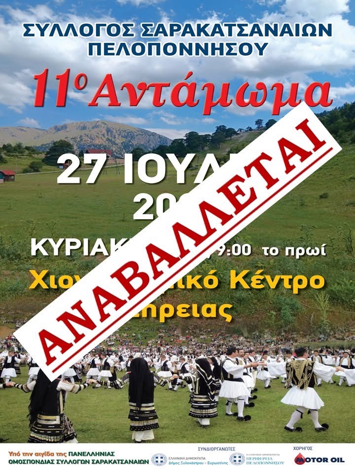 «Με αίσθημα ευθύνης, σας ενημερώνουμε ότι το Αντάμωμα των Σαρακατσαναίων Πελοποννήσου αναβάλλεται, λόγω των πρόσφατων τραγικών γεγονότων που έπληξαν την Ορεινή Κορινθία, προκαλώντας εκτεταμένες καταστροφές στο φυσικό περιβάλλον και την τοπική κοινωνία.