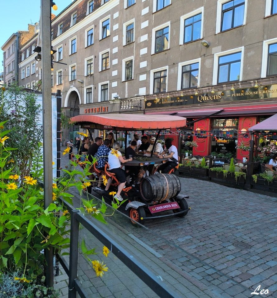 Το κατασκεύασμα που βλέπετε είναι μια τροχήλατη κινούμενη μπυραρία που κάθεσαι, πίνεις κατά βούλησιν και αντοχή, δοκιμάζεις και τα τοπικά προϊόντα αλλαντοποιίας και ταυτόχρονα ενημερώνεσαι για τα διάφορα μνημεία στα οποία σε περιφέρει ο κάπελας.