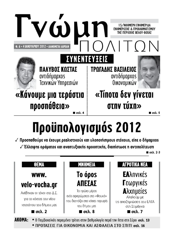 2012 Γνώμη Πολιτών, φ. 06, 4 Ιανουαρίου 2012 By gnomipoliton on 05/01/2012 • ( Σχολιάστε ) Κοινοποιήστε: Κάνε κλικ για να μοιραστείς στο X(Ανοίγει σε νέο παράθυρο) Χ Πατήστε για κοινοποίηση στο Facebook(Ανοίγει σε νέο παράθυρο) Facebook Μου αρέσει! Φόρτωση... Σχετικά Κατηγορίες:2012, ΠΑΛΙΑ ΤΕΥΧΗ Tagged as: ΔΗΜΟΣ ΒΕΛΟΥ-ΒΟΧΑΣ