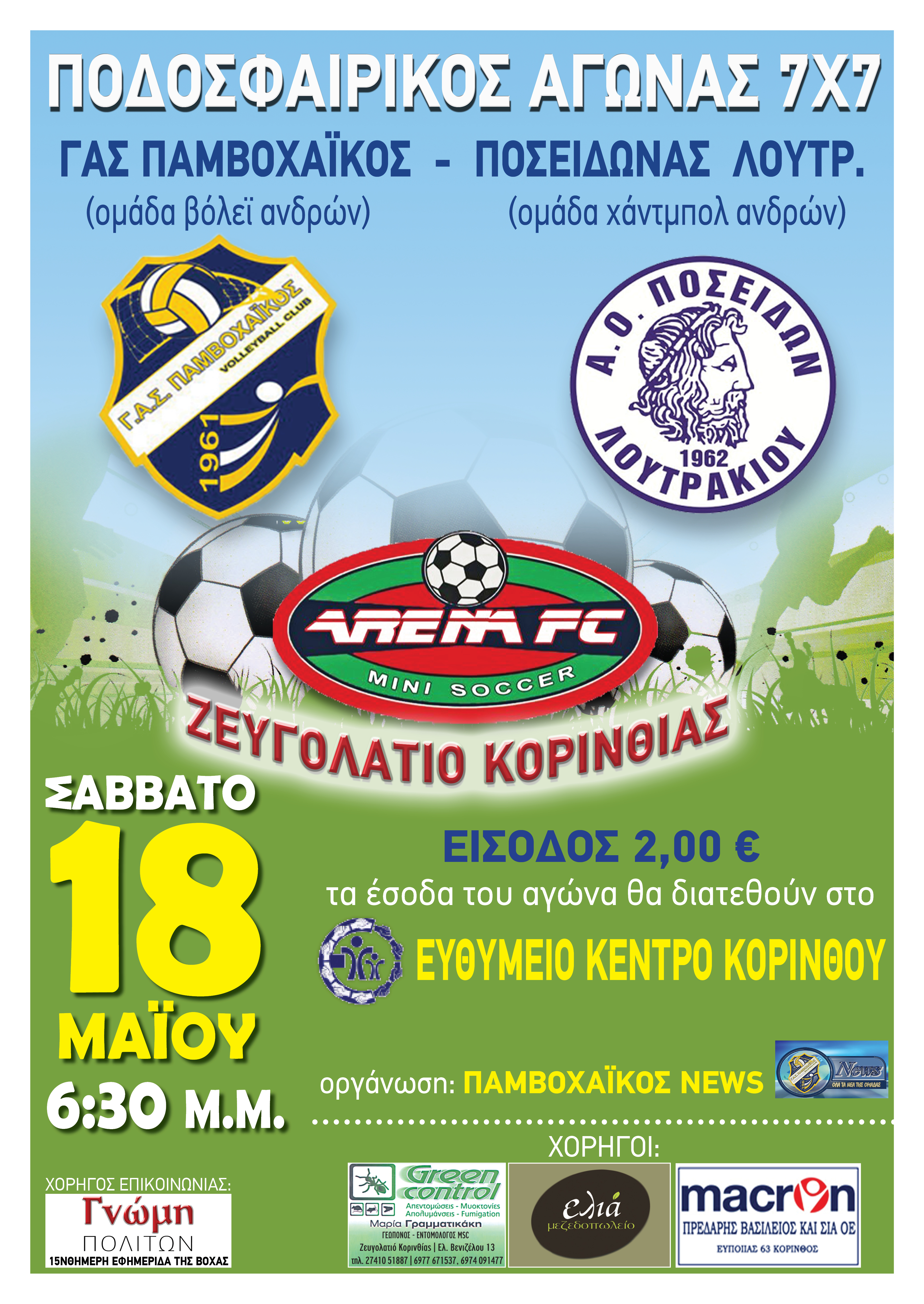 H Σελίδα κοινωνικής δικτύωσης ‘’ΠΑΜΒΟΧΑΙΚΟΣ NEWS’’ σε συνεργασία με το Αθλητικό Κέντρο ΄΄ARENA FC’’ (πρώην Αθλοχώρος) στο Ζευγολατιό Κορινθίας διοργανώνει φιλανθρωπικό αγώνα ποδοσφαίρου 7Χ7 μεταξύ των ΓΑΣ Παμβοχαϊκός και του Ποσειδώνα Λουτρακίου.