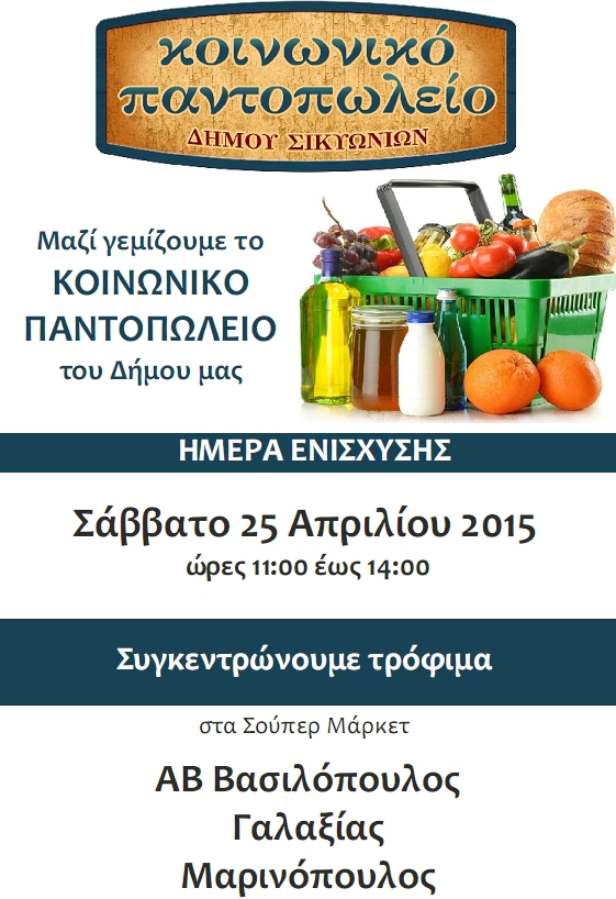 Το Σάββατο 25 Απριλίου και ώρες 11:00 έως 14:00 ομάδα εθελοντών θα βρίσκεται στα σούπερ μάρκετ ΑΒ Βασιλόπουλος, Γαλαξίας και Μαρινόπουλος στο Κιάτο και θα συγκεντρώνει τρόφιμα κλπ είδη για το «Κοινωνικό Παντοπωλείο» του Δήμου μας.