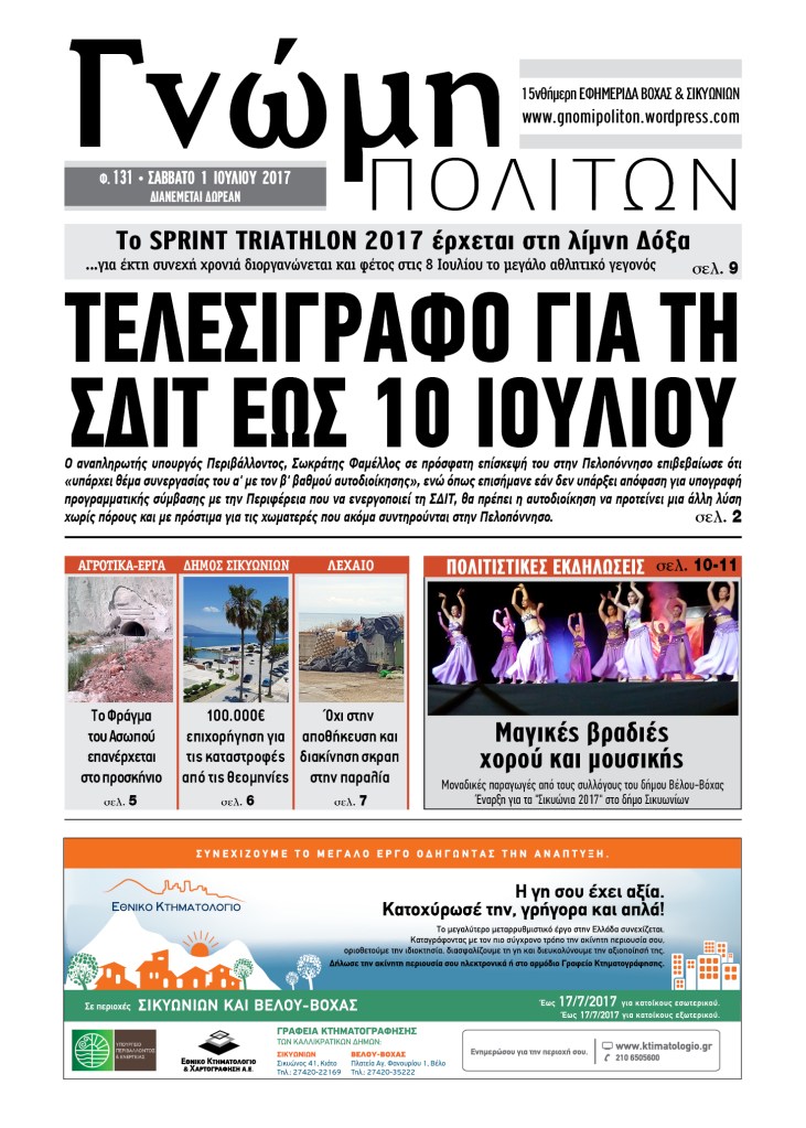 2017 Γνώμη Πολιτών, φ. 131, Σάββατο 1 Ιουλίου 2017 By gnomipoliton on 06/07/2017 • ( Σχολιάστε ) Κοινοποιήστε: Κάνε κλικ για να μοιραστείς στο X(Ανοίγει σε νέο παράθυρο) Χ Πατήστε για κοινοποίηση στο Facebook(Ανοίγει σε νέο παράθυρο) Facebook Μου αρέσει! Φόρτωση... Σχετικά Κατηγορίες:2017, ΠΑΛΙΑ ΤΕΥΧΗ