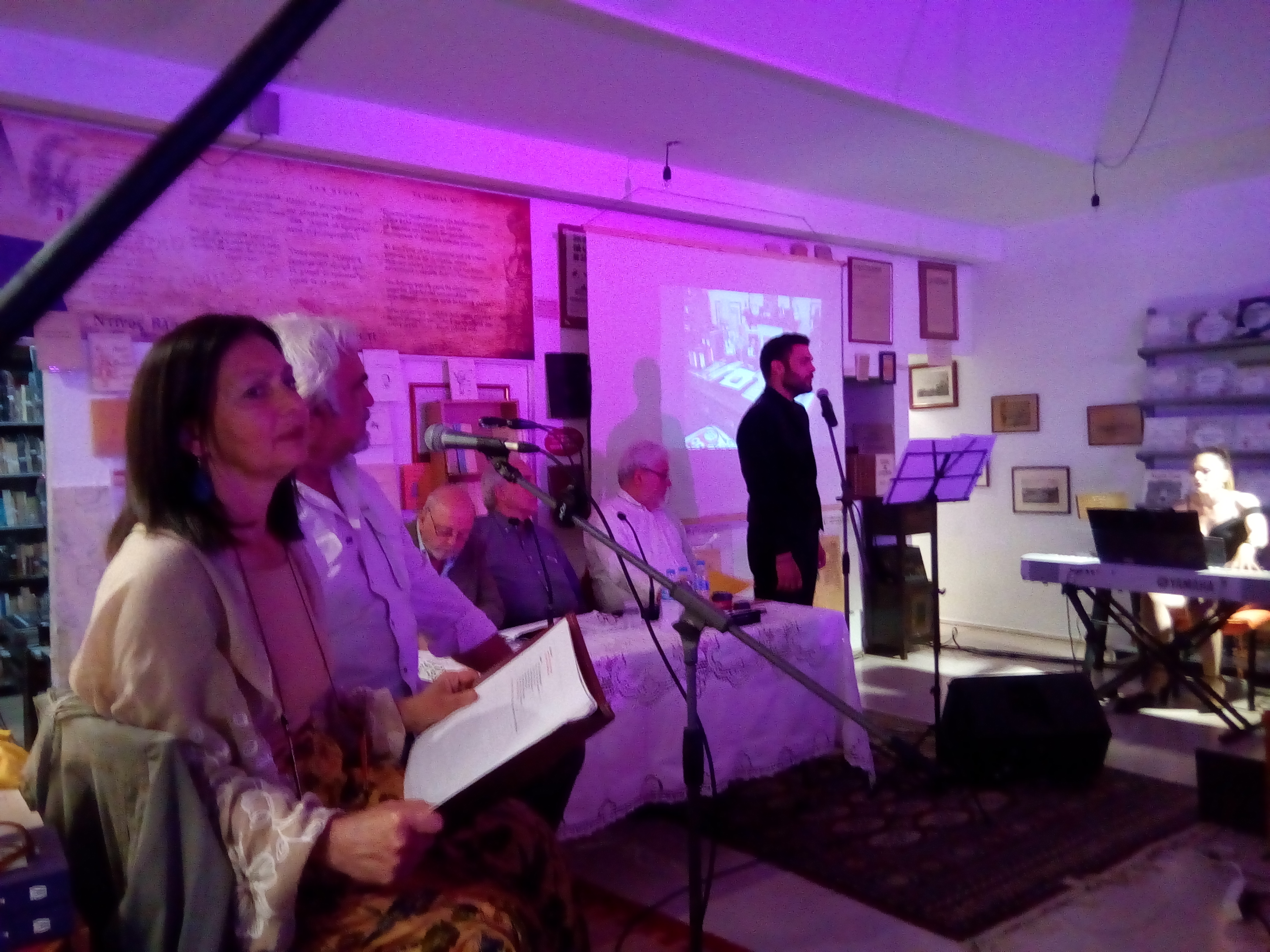 Σε πρώτο πλάνο η ηθοποιός Πολυξένη Ορκοπούλου, η οποία συγκίνησε με τις απαγγελίες της, δίπλα της ο Ηλίας Λέκκας που καθήλωσε το κοινό με τις απαγγελίες και την αφήγηση, το πάνελ των ομιλητών (από αριστερά Γιάννης Σιώκος, Κώστας Βασιλείου, Λεωνίδας Στεργιόπουλος) ο Βαγγέλης Τζελέπης αποδίδει το μελοποιημένο από τον Τάκη Τζεβελέκο ποίημα του Ντίνου Βλαχογιάννη, ενώ τον συνοδεύει στο πιάνο η Γκρέκα Πετούμενου.