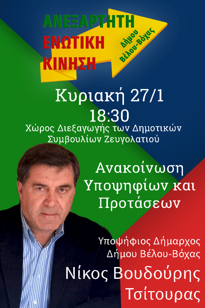 Στην αίθουσα διεξαγωγής των δημοτικών συμβουλίων του δήμου Βέλου-Βόχας ο υποψήφιος δήμαρχος Βέλου-Βόχας Νίκος Βουδούρης (Τσίτουρας) θα προβεί στην ανακοίνωση υποψηφίων και προτάσεων του συνδυασμού του ενόψει των εκλογών της 26ης Μαΐου 2019.