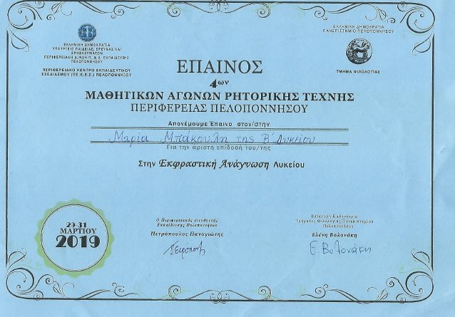Ιδιαίτερα συγχαρητήρια θέλω να δώσω στη Μαρία Μπάκουλη, η οποία πήρε το πρώτο βραβείο στο αγώνισμα «εκφραστική ανάγνωση του Λυκείου».