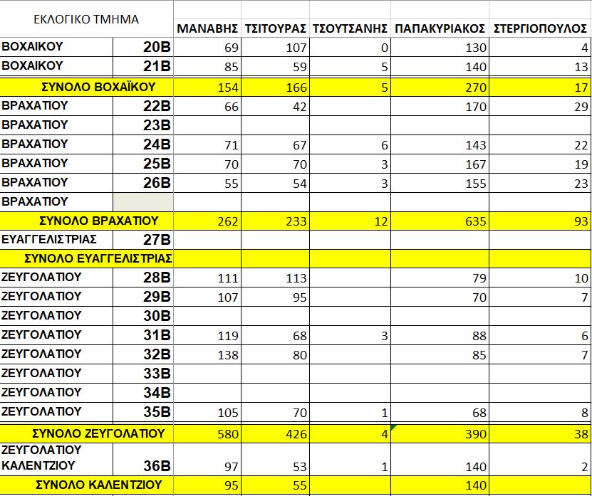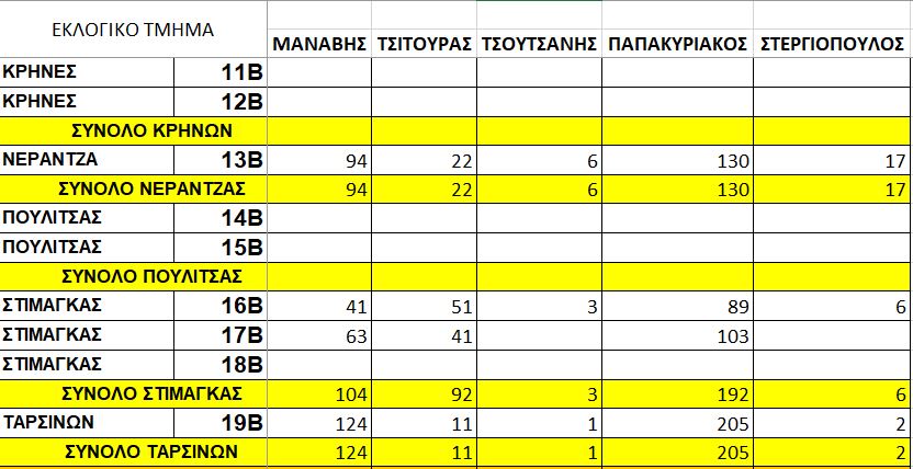 Με ενσωματωμένα τα 3/4 των εκλογικών τμημάτων ο Αννίβας Παπακυριάκος βρίσκεται στην πρώτη θέση με ποσοστό περίπου 46,5%, ο Θανάσης Μανάβης στη δεύτερη θέση με ποσοστό 29,5%, ο Νίκος Βουδούρης-Τσίτουρας στην τρίτη θέση με ποσοστό 18,5%, ο Λεωνίδας Στεργιόπουλος στην τέταρτη θέση με ποσοστό και τελευταίος ο Δημήτρης Τσουτσάνης με ποσοστό περίπου 1,5%.