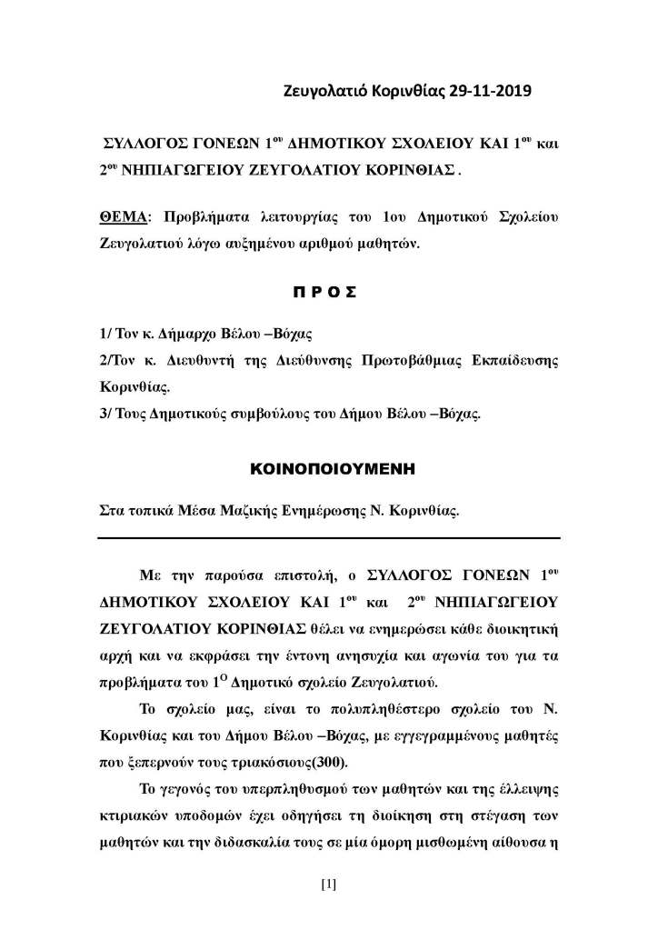 Ο Σύλλογος Γονέων και Κηδεμόνων 1ου Δημοτικού Σχολείου και 1ου & 2ου Νηπιαγωγείου Ζευγολατιού εκφράζει την αμέριστη υποστήριξή του στο αίτημα των γονέων και καλεί τον πρόεδρο του Δημοτικού Συμβουλίου Βέλου-Βόχας να εφαρμόσει τον κανονισμό και να κάνει δεκτό το αίτημα των γονέων για συζήτηση και λήψη απόφασης επί του θέματος στο προσεχές δημοτικό συμβούλιο.