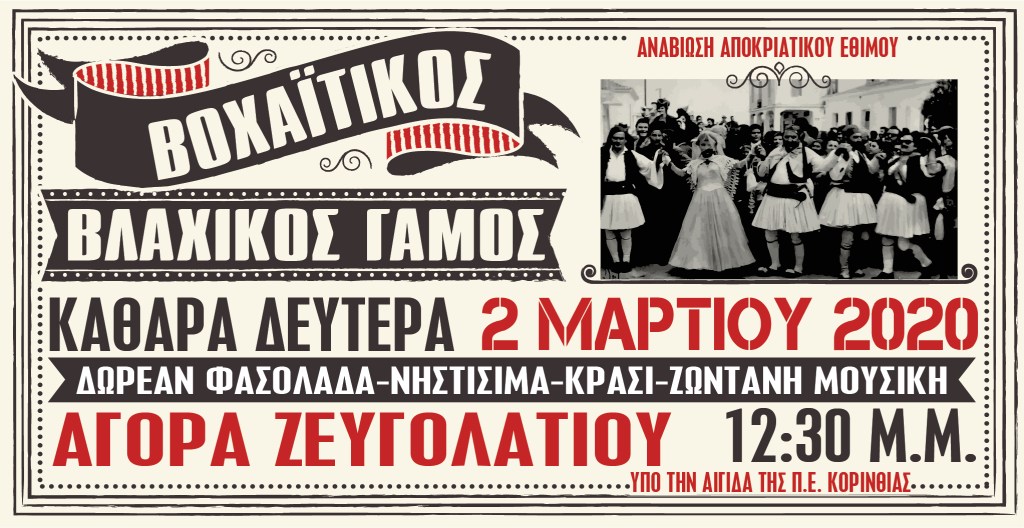 Εν αναμονή λοιπόν του Βλάχικου Γάμου, την Καθαρά Δευτέρα 2 Μαρτίου, ώρα 12:30 στην αγορά Ζευγολατιού ΚΟΡΙΝΘΙΑΣ. Να είστε όλοι εκεί!