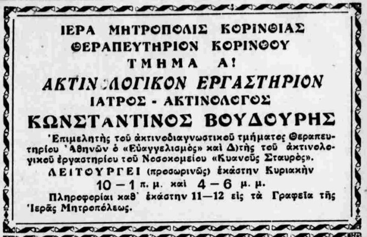 «Ο Σεβασμιότατος Μητροπολίτης Κορινθίας», αναφέρει η “Κορινθία” «εμελέτησε το ζήτημα της εγκαταστάσεως και λειτουργίας των καινουργών μηχανημάτων ακτίνων Rontgen τα οποία ανήκουν κατά κυριότητα και απόλυτον κατοχήν εις την Ιεράν Μητρόπολιν Κορινθίας προς χρήσιν του κοινού της επαρχίας ταύτης».