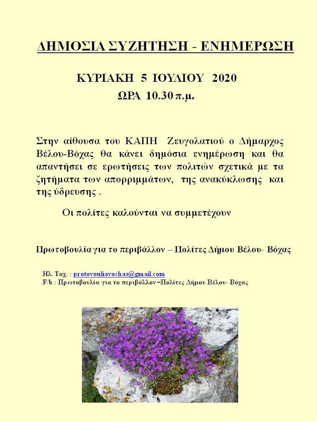 Δημόσια συζήτηση-Ενημέρωση διοργανώνει Ομάδα «Πρωτοβουλία για το περιβάλλον – Πολίτες Δήμου Βέλου-Βόχας», στην οποία ο Δήμαρχος θα απαντήσει σε ερωτήματα σχετικά με την διαχείριση των απορριμμάτων, την ανακύκλωση και την ύδρευση.