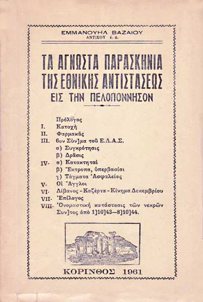 - Εμμανουήλ Βαζαίος, «Τα άγνωστα παρασκήνια της Εθνικής Αντιστάσεως εις την Πελοπόννησον», Κόρινθος 1961