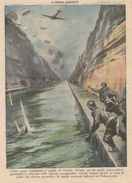 Στα τέλη Απριλίου του 1941 οι Γερμανοί είχαν φτάσει στον Ισθμό. Οι αλεξιπτωτιστές του Χίτλερ έπεφταν κατά σμήνη στη στενή γέφυρα γης για να την καταλάβουν και οι οπισθοχωρούντες Άγγλοι μαζί με τις τελευταίες τουφεκιές τους, ανατίναξαν και τη Διώρυγα. Μαζί και τη διπλή, χαλύβδινη γέφυρα, σιδηροδρομική και οδική που εξυπηρετούσε τη συγκοινωνία.