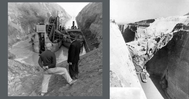 Το κανάλι της Κορίνθου ήταν μία από τις μεγαλύτερες κατασκευαστικές προκλήσεις που αντιμετώπισε η εταιρεία. Μόνο 7 χιλιόμετρα σε μήκος, εξοικονομούσε στη ναυσιπλοΐα περίπου 200 χιλιόμετρα περίπλου της Πελοποννήσου, από την ανατολική προς τη δυτική Ελλάδα. Η υποχώρηση των Γερμανών όπως είπαμε είχε προκαλέσει τεράστια ζημιά. Επιπλέον, η παντελής έλλειψη συντήρησης στη διάρκεια του πολέμου είχε επηρεάσει τους κυματοθραύστες της εισόδου με αποτέλεσμα το κανάλι να χτυπιέται αλύπητα από τη θάλασσα και η ύπαρξή του να καθίσταται απολύτως επισφαλής.
