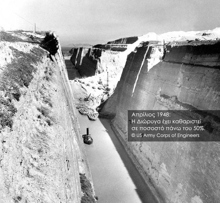 Εννέα μήνες μετά, σαν σήμερα στις 6 Ιουλίου 1948 η Διώρυγα παραδόθηκε στην κυκλοφορία για τα μικρής χωρητικότητας πλοία, αφού ένα μελίσσι ανθρώπων δούλεψε εντατικά και ακατάπαυστα απομακρύνοντας τόνους χωμάτων και μετάλλων από το θαλάσσιο πέρασμα.