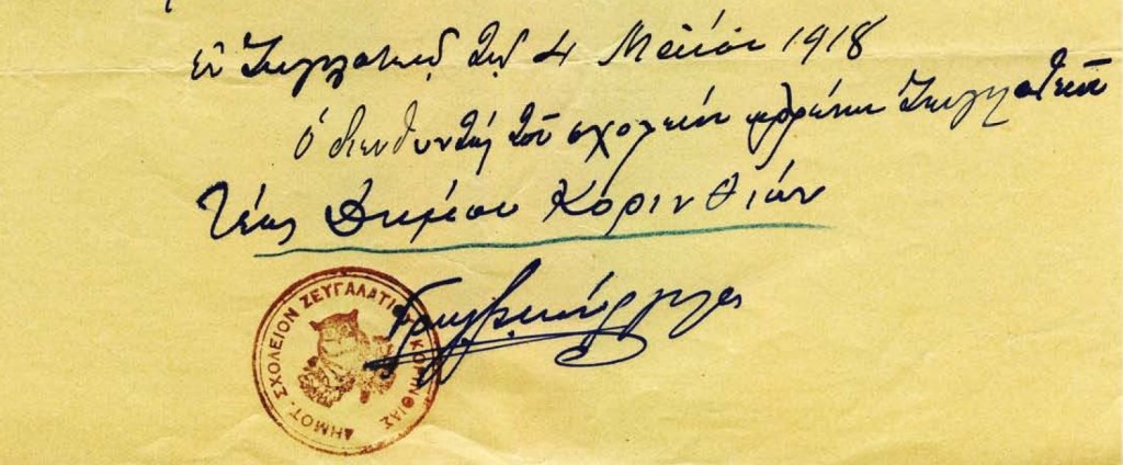 Υπογραφή του Δ/ντή (Γρ. Μούργελα) και σφραγίδα του Σχολείου. (Αρχείο Ι.Βαλασόπουλου)