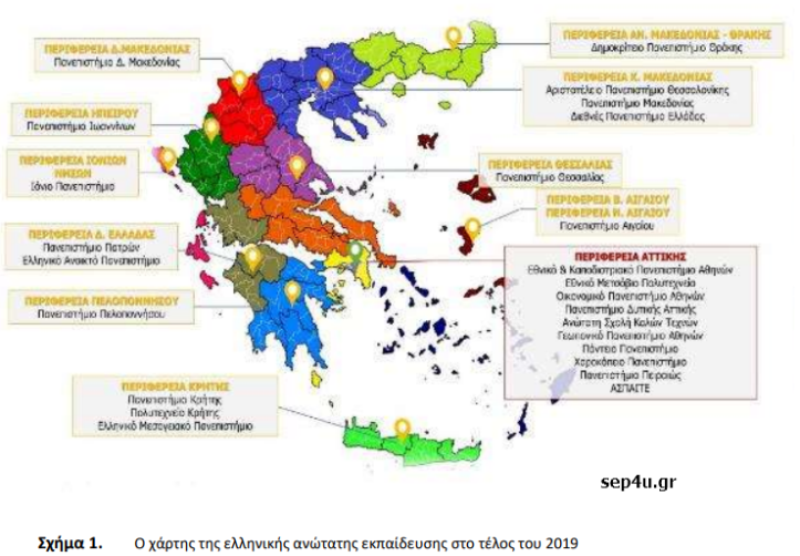 Ο νέος χάρτης της ανώτατης εκπαίδευσης της χώρας μας, όπως αυτός διαμορφώθηκε μετά τις συγχωνεύσεις ιδρυμάτων κατά τα δύο τελευταία έτη (2018 & 2019), περιλαμβάνει 25 ιδρύματα ανώτατης εκπαίδευσης, εκ των οποίων 24 είναι Πανεπιστήμια και ένα παραμένει ΑΤΕΙ (η ΑΣΠΑΙΤΕ).