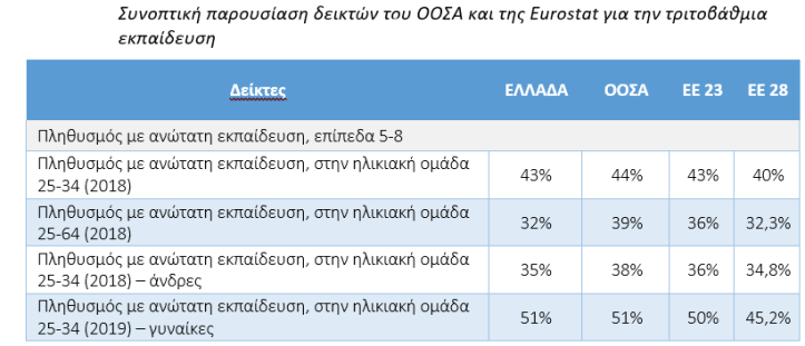 Η Ελλάδα βρίσκεται στις τελευταίες θέσεις των χωρών του ΟΟΣΑ τόσο στην απασχόληση των πτυχιούχων τριτοβάθμιας εκπαίδευσης ηλικίας 25-64 (74%) όσο και των νέων αποφοίτων ηλικίας 25-34 (70%) (επίπεδα 5-8) απέχοντας 14 ποσοστιαίες μονάδες από τον μέσο όρο των χωρών του ΟΟΣΑ.