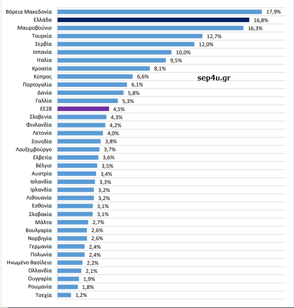 Σύμφωνα με στοιχεία της Eurostat, το 2019, η Ελλάδα εμφανίζει το υψηλότερο ποσοστό ανεργίας στις χώρες της ΕΕ τόσο στους πτυχιούχους τριτοβάθμιας εκπαίδευσης 25-39 ετών (16,8%) όσο και στο σύνολο του ενεργού πληθυσμού (17,3%).