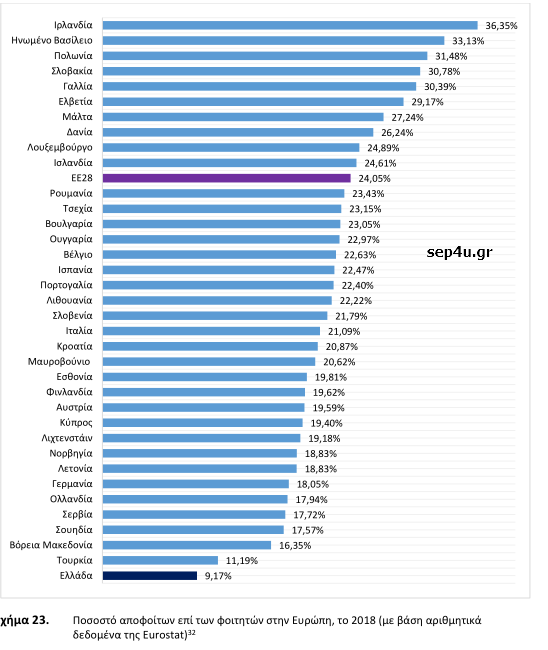 Αντίστοιχα, η Ελλάδα φέρεται να έχει το υψηλότερο συγκριτικά πλήθος εγγεγραμμένων φοιτητών (7,14%). Το ποσοστό της Ελλάδας βρίσκεται πολύ πάνω από τον μέσο όρο των χωρών της ΕΕ των 28, ο οποίος υπολογίζεται στο 3,9%.