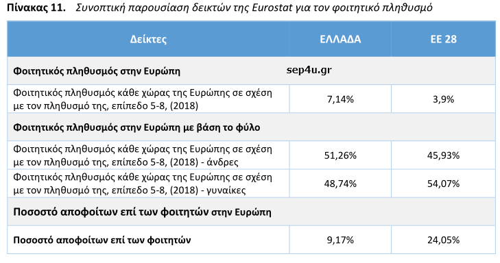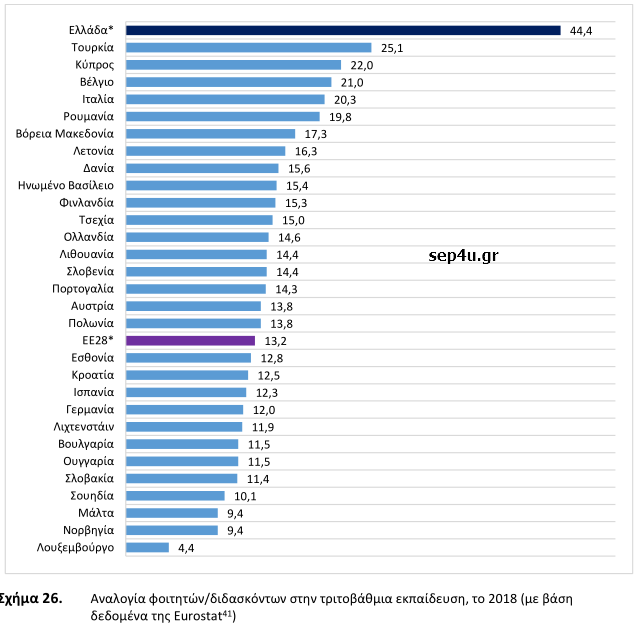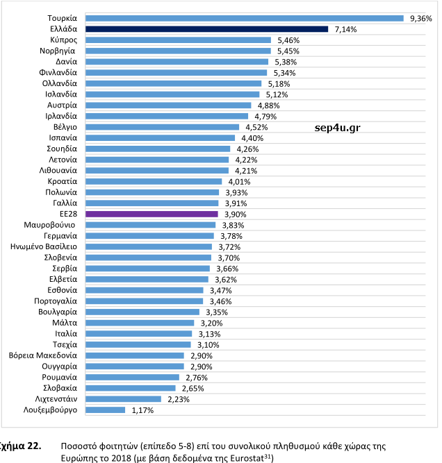 Αντίστοιχα, η Ελλάδα φέρεται να έχει το υψηλότερο συγκριτικά πλήθος εγγεγραμμένων φοιτητών (7,14%). Το ποσοστό της Ελλάδας βρίσκεται πολύ πάνω από τον μέσο όρο των χωρών της ΕΕ των 28, ο οποίος υπολογίζεται στο 3,9%.