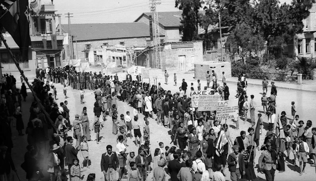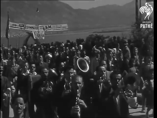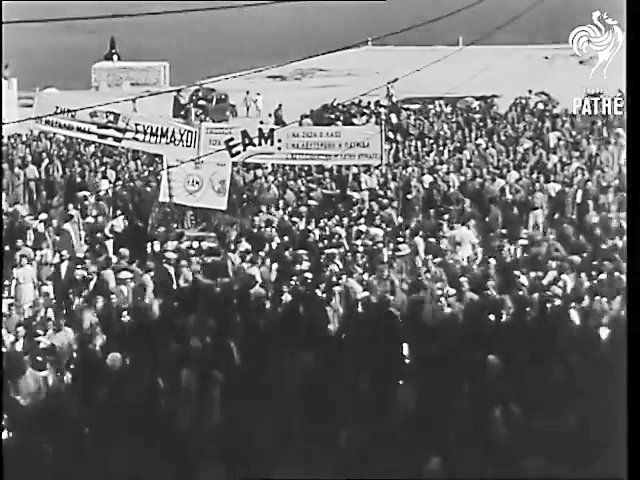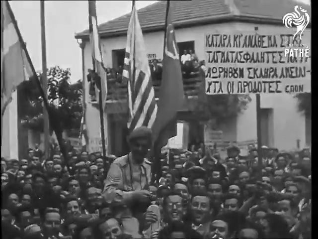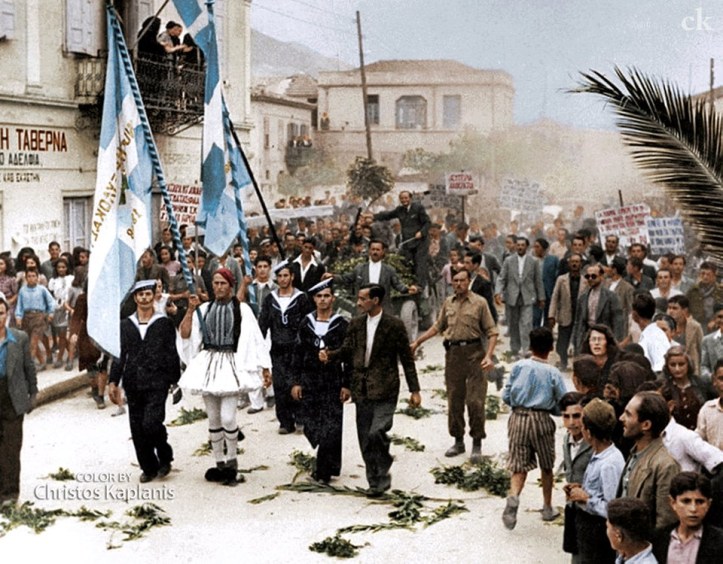 Όλοι κουβαλούσαν πλακάτ, κυρίως εικόνες που είχαν αφαιρέσει από τους τοίχους τους και στο πίσω µέρος των οποίων είτε είχαν ζωγραφίσει τις συµµαχικές σηµαίες είτε είχαν γράψει συνθήµατα του E.A.M..