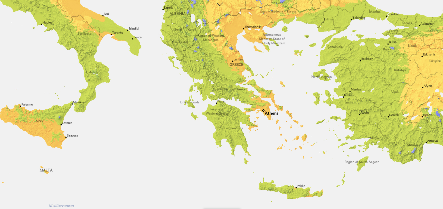 Όπως δείχνει ο διαδραστικός χάρτης στη χώρα μας θα υπάρξουν μεγάλες αλλαγές. Η Δυτική Ελλάδα και οι Πελοπόννησος θα έρθουν αντιμέτωπες με υψηλότερες θερμοκρασίες όχι όμως τόσο μεγάλες ώστε να αλλάξει το γενικότερο κλίμα της περιοχής.
