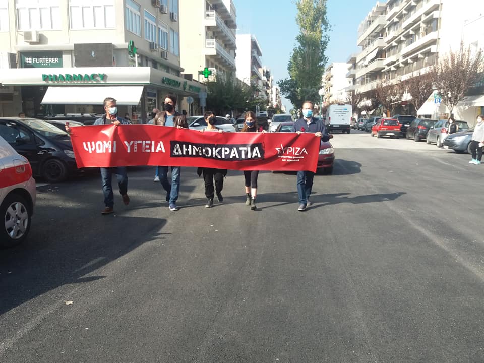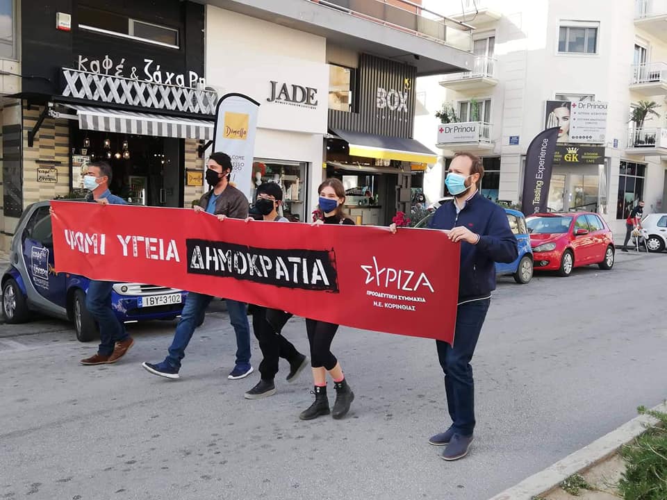 Παραφράζοντας το σύνθημα που κυριαρχούσε στην τότε εξέγερση των φοιτητών (Ψωμί, Παιδεία, Ελευθερία), αντιπροσωπεία του ΣΥΡΙΖΑ ΠΣ Κορινθίας με επικεφαλής τον βουλευτή Γιώργο Ψυχογιό, περιήλθε στους δρόμους της πόλης κρατώντας κόκκινο πανό που έγραφε «Ψωμί, Υγεία, Δημοκρατία» και φωνάζοντας συνθήματα όπως «Το Πολυτεχνείο δεν ήτανε γιορτή, ήτανε εξέγερση και πάλι λαϊκή».