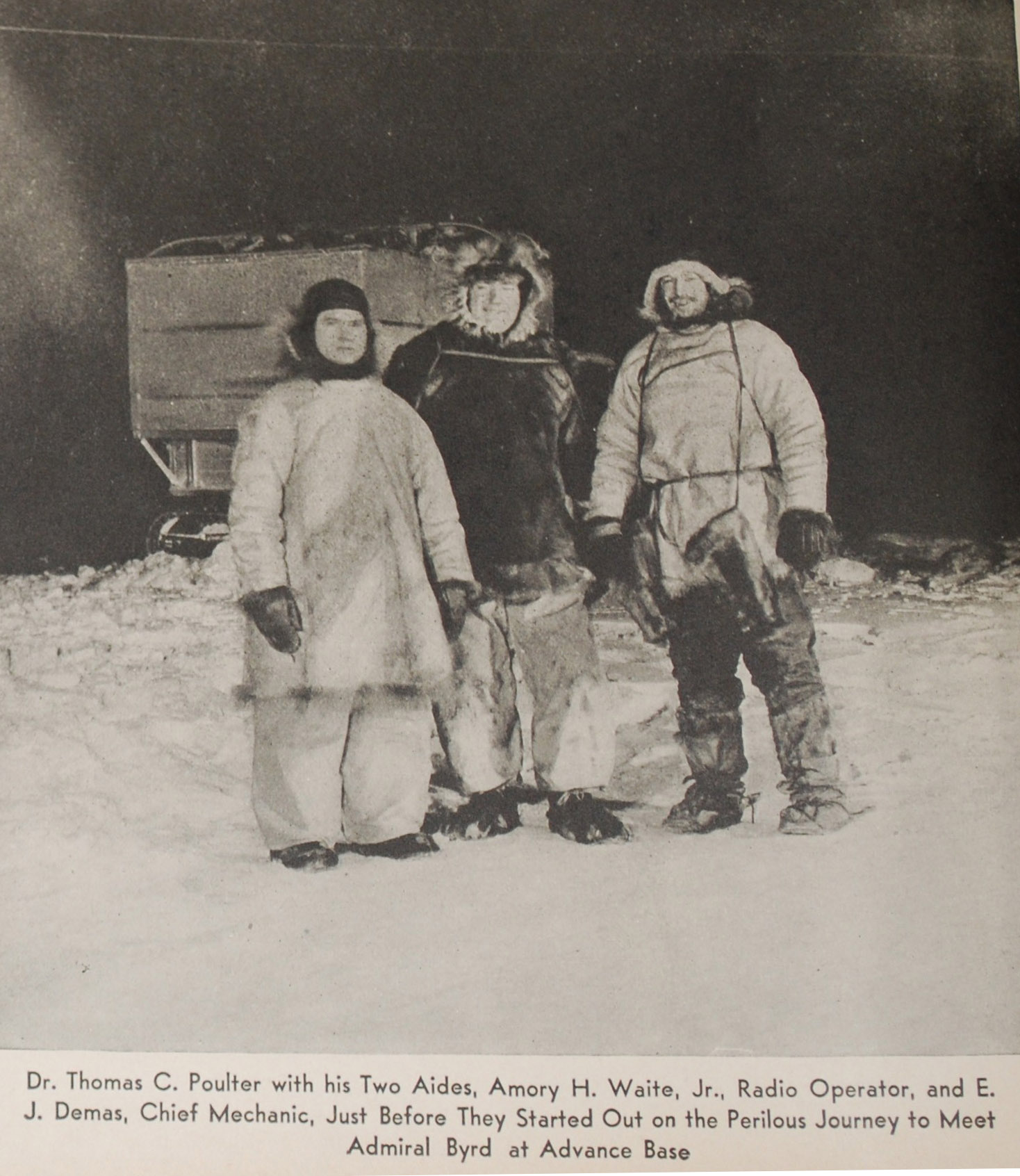 Είχαμε τρόφιμα για δυο χρόνια. Τέσσερις συσκευές ασυρμάτου, 80 κύλλους, τέσσερα αεροπλάνα, έλκηθρα κλπ. Εγώ ήμουν από τους μηχανικούς, οι οποίοι εφρόντιζαν για την καλήν διατήρησιν των αεροπλάνων. Φυσικά δεν επρόκειτο να πετάξω επάνω από τον Πόλο – ούτε ετόλμησα να ζητήσω τέτοιο πράγμα από τον Μπέρντ», εξηγεί.