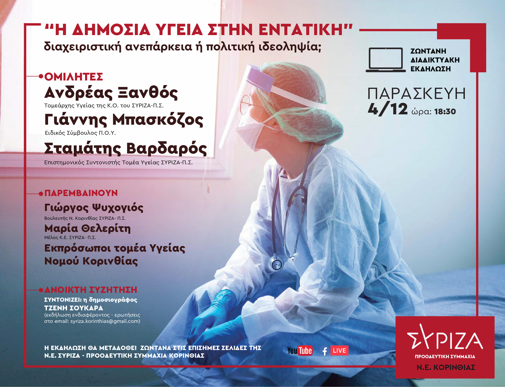 Η Νομαρχιακή Επιτροπή Κορινθίας του ΣΥΡΙΖΑ – ΠΡΟΟΔΕΥΤΙΚΗ ΣΥΜΜΑΧΙΑ, διοργανώνει ζωντανή διαδικτυακή εκδήλωση με θέμα: «Η δημόσια υγεία στην εντατική-διαχειριστική ανεπάρκεια ή πολιτική ιδεοληψία;»