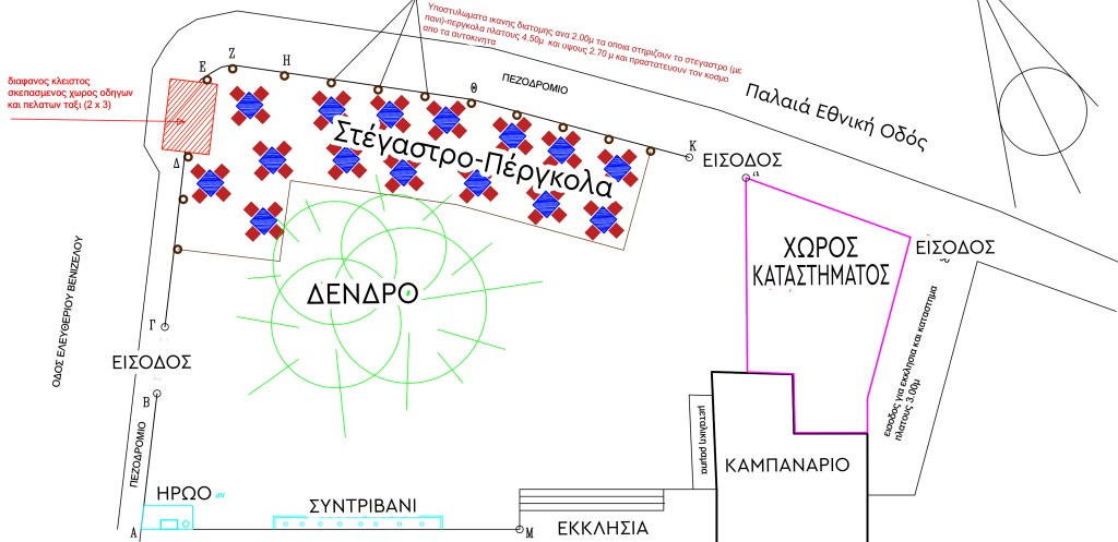 -κατασκευή σκιάστρου στη βορειοδυτική γωνία και ανάπτυξη τραπεζοκαθισµάτων από κάτω.