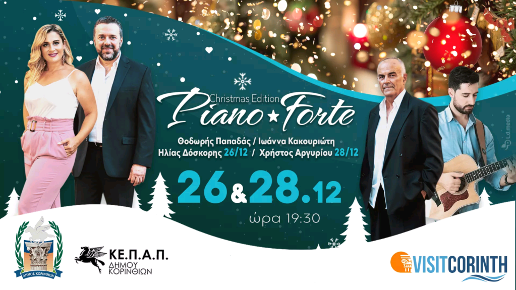 Το Σάββατο 26 και τη Δευτέρα 28 Δεκεμβρίου και ώρα 7.30 μ.μ. θα παρακολουθήσουμεδυο μελωδικές βραδιές με την ορχήστρα Piano Forte Christmas Edition. Στα πλήκτρα ο μαέστρος Θοδωρής Παπαδάς, στα πνευστά ο Γιάννης Τζέλης, στην ηλεκτρική κιθάρα ο Γιώργος Παππάς. Τραγουδούν η Ιωάννα Κακουριώτη, ο Ηλίας Δόσκορης και ο Χρήστος Αργυρίου.