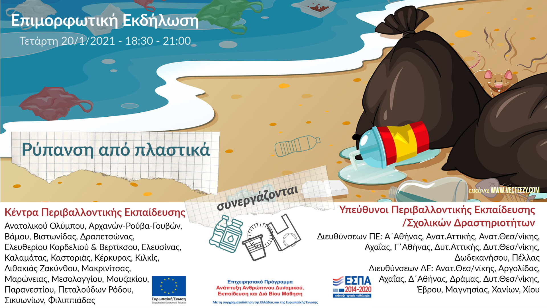 Επιμορφωτική εκδήλωση με θέμα «Ρύπανση από πλαστικά» διοργανώνεται την Τετάρτη 20/1/2021, και ώρες 6.30-9.00 μμ. με την συνεργασία 20 Κέντρων Περιβαλλοντικής Εκπαίδευσης (ΚΠΕ) και 19 Υπευθύνων Περιβαλλοντικής Εκπαίδευσης και Σχολικών Δραστηριοτήτων από Διευθύνσεις Πρωτοβάθμιας και Δευτεροβάθμιας Εκπαίδευσης όλης της χώρας.