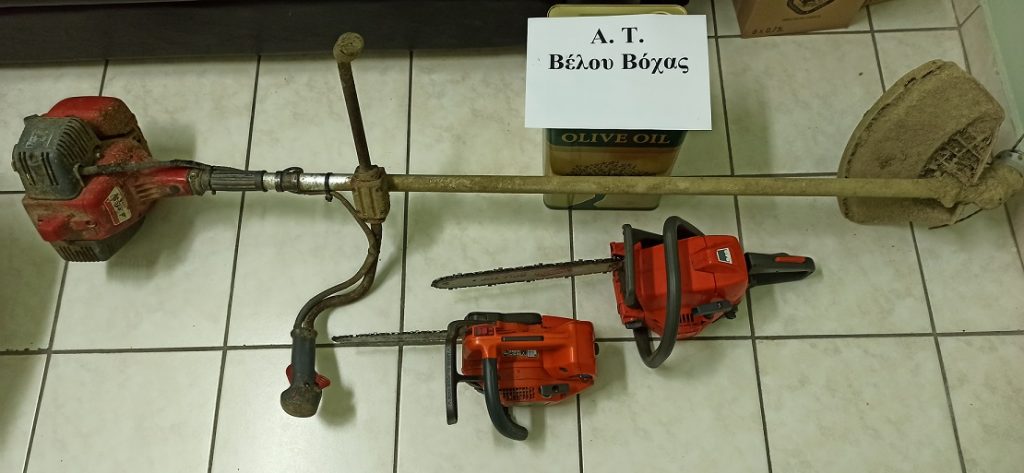 Ο συλληφθείς λίγες ώρες νωρίτερα, σε τοπική κοινότητα του Δήμου Βέλου- Βόχας Κορινθίας, μαζί με 27χρονο ημεδαπό, ο οποίος αναζητείται, είχαν αφαιρέσει από αποθήκη ημεδαπού -2- αλυσοπρίονα, -1- χορτοκοπτικό και -3- τενεκέδες λάδι, τα οποία βρέθηκαν και αποδόθηκαν στον ιδιοκτήτη τους.