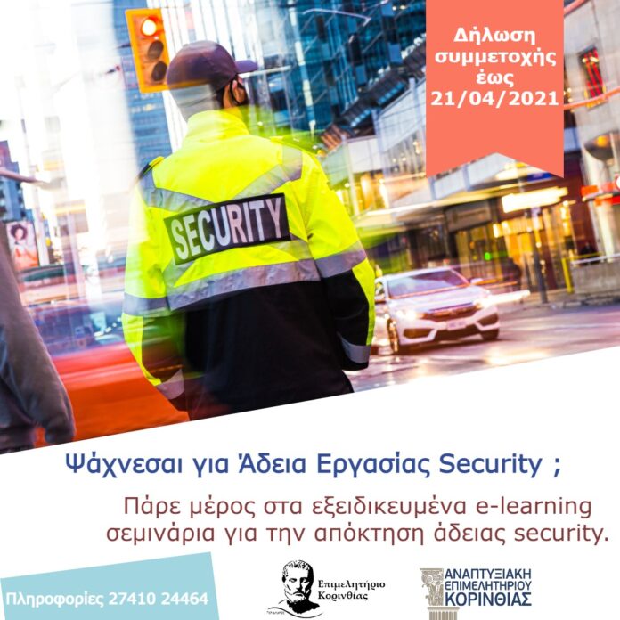 Περισσότερες πληροφορίες και δήλωση συμμετοχής για την απόκτηση πιστοποιημένης άδειας security καλώντας στο 27410 24464 (934,931,924) ή στέλνοντας email: anaptyxiaki@korinthiacc.gr