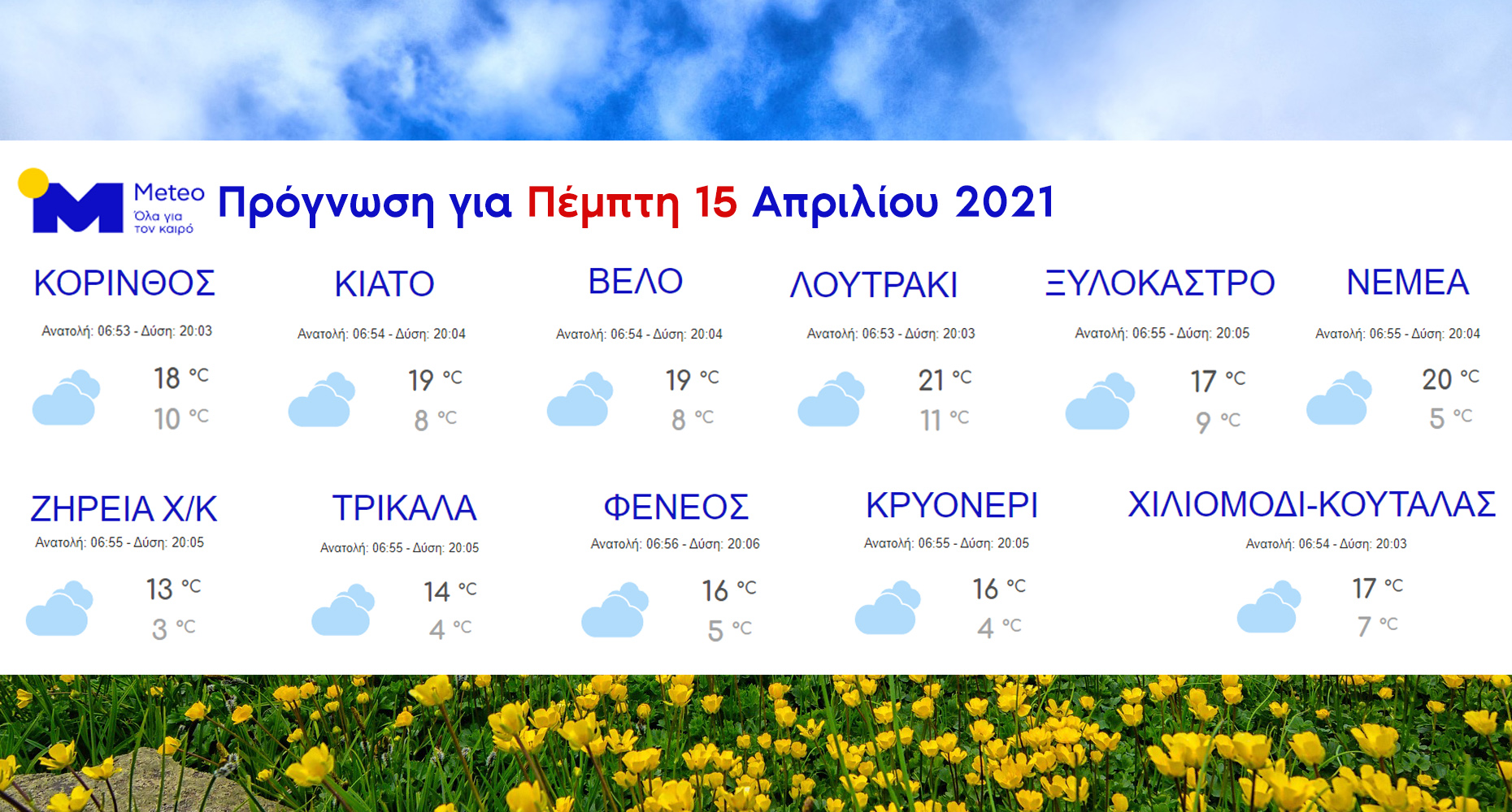 Καλές καιρικές συνθήκες αναμένεται να επικρατήσουν στο μεγαλύτερο κομμάτι της χώρας μας κατά την διάρκεια της Πέμπτης, καθώς τα διαστήματα με ηλιοφάνεια θα είναι μεγάλα στις περισσότερες ηπειρωτικές και νησιωτικές περιοχές. Κάποιες νεφώσεις ωστόσο δεν θα λείπουν κατά διαστήματα κυρίως από τα δυτικά, τα νότια και τα ανατολικά τμήματα, ενώ στο βορειοανατολικό Αιγαίο ίσως ψιχαλίσει ή βρέξει ασθενώς το πρώτο μισό της ημέρας.