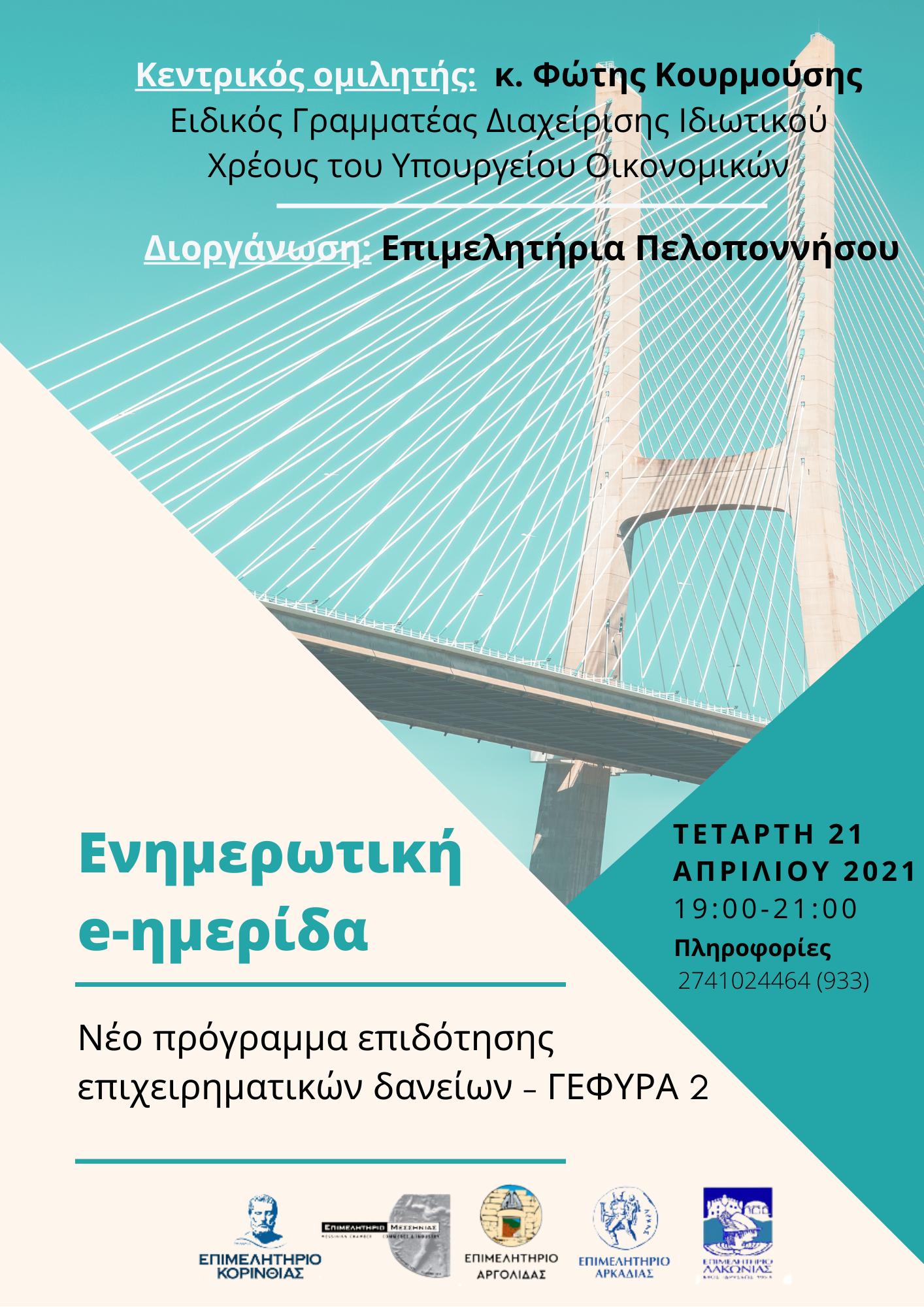 Ενημερωτική τηλεδιάσκεψη διοργανώνει το Περιφερειακό Επιμελητηριακό Συμβούλιο Πελοποννήσου με θέμα «Παρουσίαση του Νέου Προγράμματος Επιδότησης Επιχειρηματικών Δανείων – ΓΕΦΥΡΑ 2». Κεντρικός ομιλητής θα είναι ο κ. Φώτης Κουρμούσης, Ειδικός Γραμματέας Διαχείρισης Ιδιωτικού Χρέους του Υπουργείου Οικονομικών.