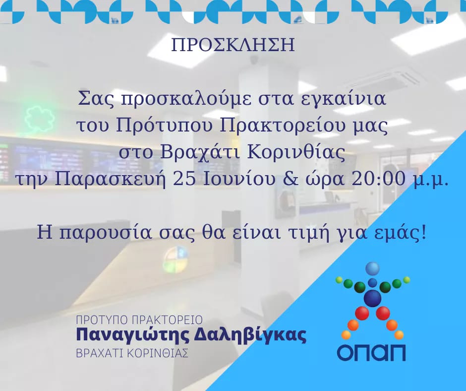 ΕΚΔΗΛΩΣΕΙΣ Εγκαίνια για το πρότυπο πρακτορείο ΟΠΑΠ «Δαληβίγκα» στο Βραχάτι By gnomipoliton on 15/06/2021 • ( Σχολιάστε ) Το πρότυπο πρακτορείο ΟΠΑΠ στο Βραχάτι, ιδιοκτησίας Παναγιώτη Δαληβίγκα, καλεί τους φίλους της τύχης στα εγκαίνια του, στις 25 Ιουνίου, ώρα 8:00 το βράδυ, για μια βραδιά ξεχωριστή, με φαγητό και ποτό. Κοινοποιήστε: Κάνε κλικ για να μοιραστείς στο X(Ανοίγει σε νέο παράθυρο) Χ Πατήστε για κοινοποίηση στο Facebook(Ανοίγει σε νέο παράθυρο) Facebook Μου αρέσει! Φόρτωση... Σχετικά Κατηγορίες:ΕΚΔΗΛΩΣΕΙΣ