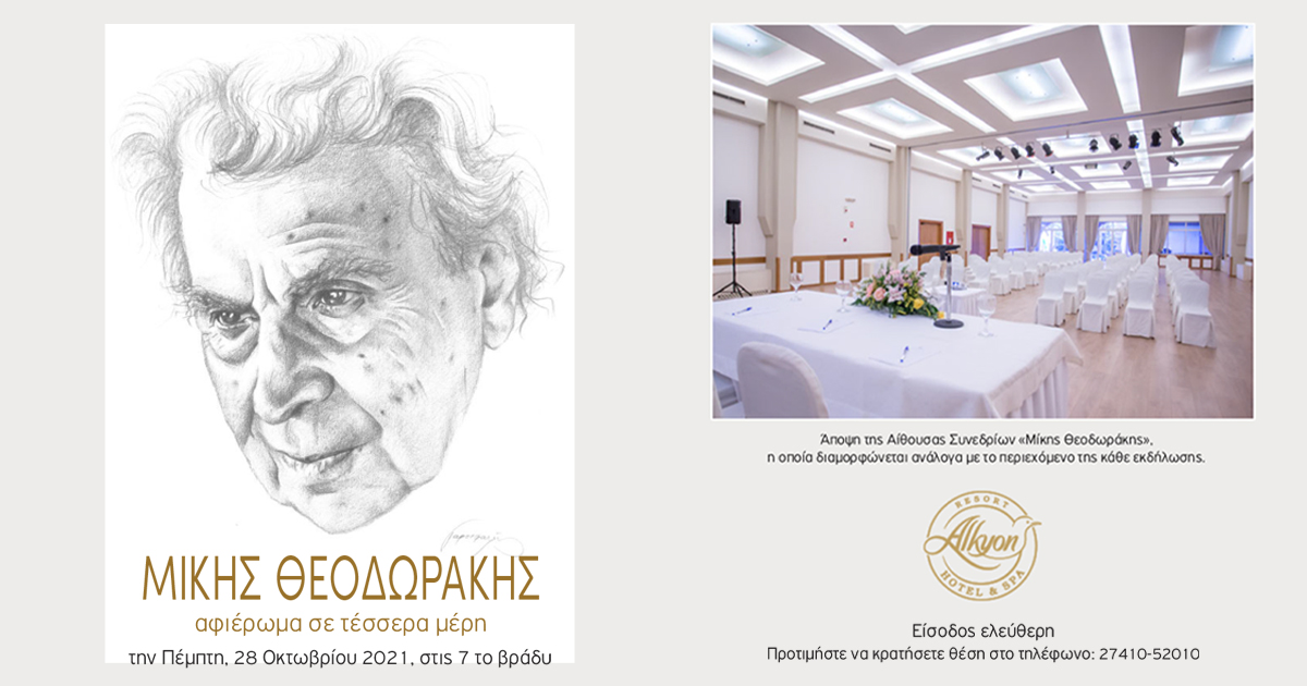 Υπό την αιγίδα του Δήμου Βέλου-Βόχας θα πραγματοποιηθεί την Πέμπτη 28 Οκτωβρίου στο ξενοδοχείο Alkyon Resort Hotel & Spa στο Βραχάτι, ειδική τιμητική εκδήλωση με τον τίτλο «Μίκης Θεοδωράκης – Αφιέρωμα σε τέσσερα μέρη».