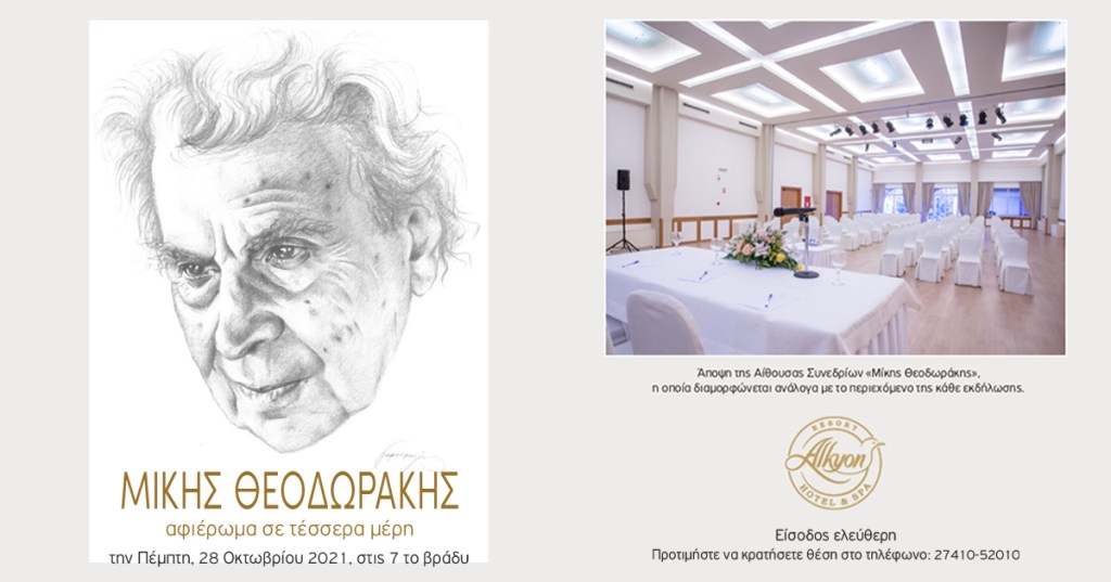 Η εκδήλωση, που θα πραγματοποιηθεί στις 7:00 το βράδυ, στην Αίθουσα Συνεδρίων «Μίκης Θεοδωράκης» είχε προγραμματιστεί πριν από την εκδημία του Μίκη Θεοδωράκη.