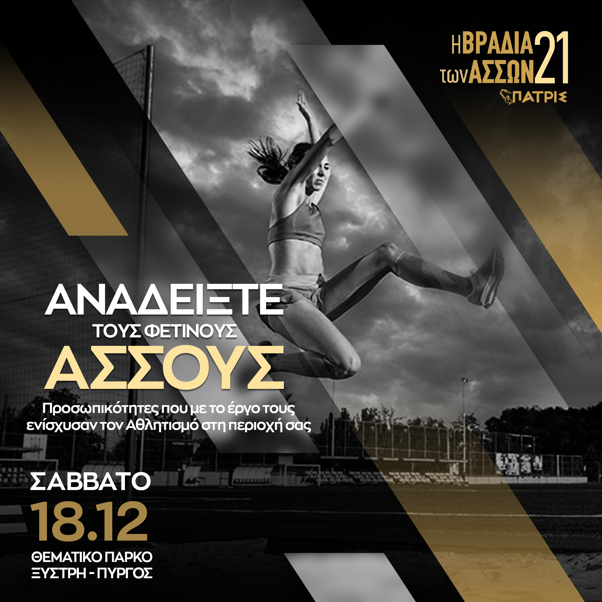 Η Βραδιά των Άσσων για πέντε συνεχόμενα χρόνια, έγινε σημείο αναφοράς για την Ηλεία επιβραβεύοντας τις επιτυχίες των αθλητών μας, τις αξίες του συναγωνισμού και της ευγενούς άμιλλας, το ήθος, την προσπάθεια, την αυταπάρνηση και την προσφορά! Με νέο σχεδιασμό, καινούρια πρόσωπα, ανανεωμένες ιδέες και σε διαφορετικές συνθήκες, αλλά σταθερά με την τοπική κοινωνία στο πλευρό μας ετοιμαζόμαστε όλοι μαζί για να γράψουμε μια ακόμα λαμπρή σελίδα στη ιστορία του ηλειακού αθλητισμού και σε αυτή την προσπάθεια σας θέλουμε αρωγούς και συνοδοιπόρους.