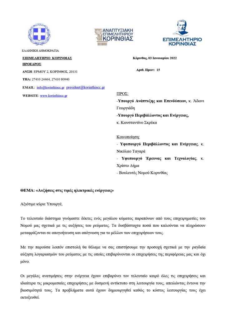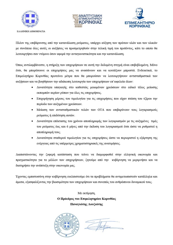 Σε κάθε περίπτωση η κραυγή αγωνίας των μικρομεσαίων και της κορινθιακής αγοράς, που το Επιμελητήριο Κορινθίας εκφράζει μέσα από την επιστολή του, αποτελεί τη ζοφερή πραγματικότητα και τα αντισταθμιστικά μέτρα που προτείνονται, αν και μοιάζουν επιφυλακτικά και δειλά, είναι προς τη σωστή κατεύθυνση και γι’ αυτό, τα ακούμε με προσοχή, τα προσυπογράφουμε, ενώνουμε τις δυνάμεις μας και τα διεκδικούμε μαζί τους. Το αμφίβολο είναι, όπως και σε άλλες ανάλογες περιπτώσεις, αν τα ακούει κανείς από την κυβέρνηση των α(χ)ρίστων! Αλήθεια, ακούει κανείς;», καταλήγει.