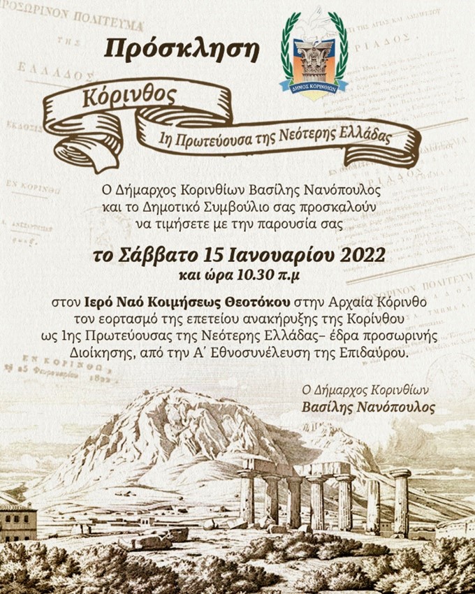 Ο Δήμος Κορινθίων, δεδομένης της ιδιαιτέρως επιβαρυμένης επιδημιολογικής εικόνας της χώρας και σταθερά προσανατολισμένος στην διασφάλιση της ατομικής και δημόσιας υγείας, προχωρά στην ακύρωση των προγραμματισμένων εκδηλώσεων του στην Αρχαία Κόρινθο, για την ανάδειξη της ως πρώτης πρωτεύουσας της νεότερης Ελλάδας, όπως αυτές είχαν καθοριστεί για τις 15 Ιανουαρίου 2022.