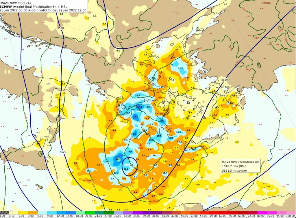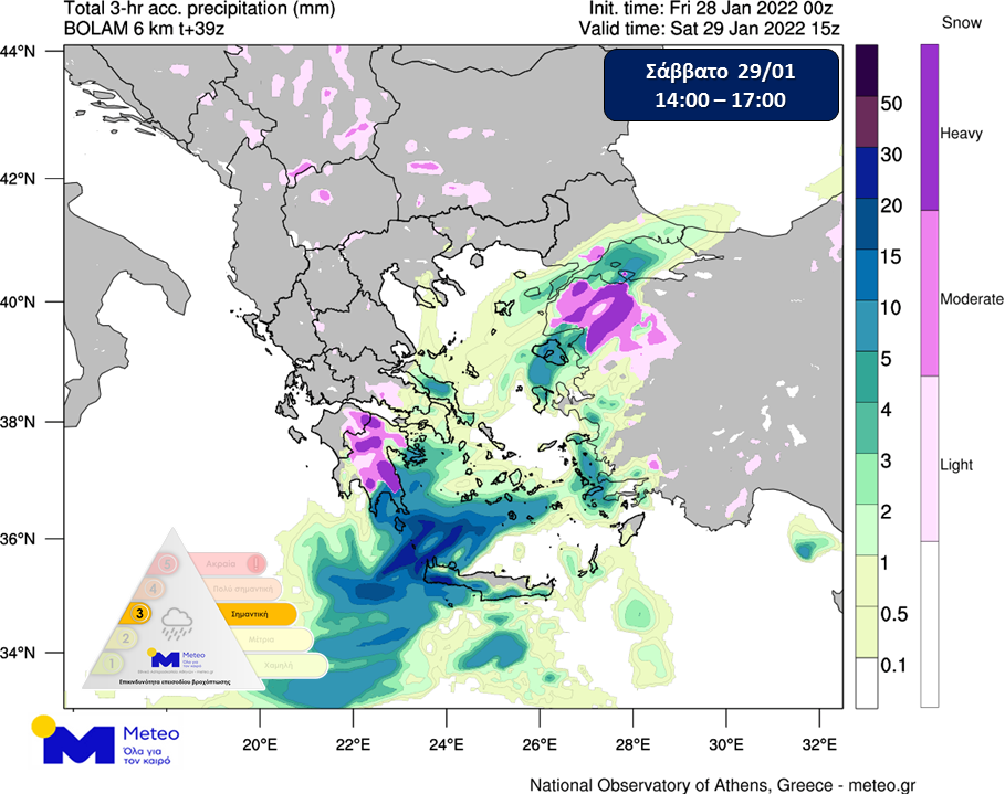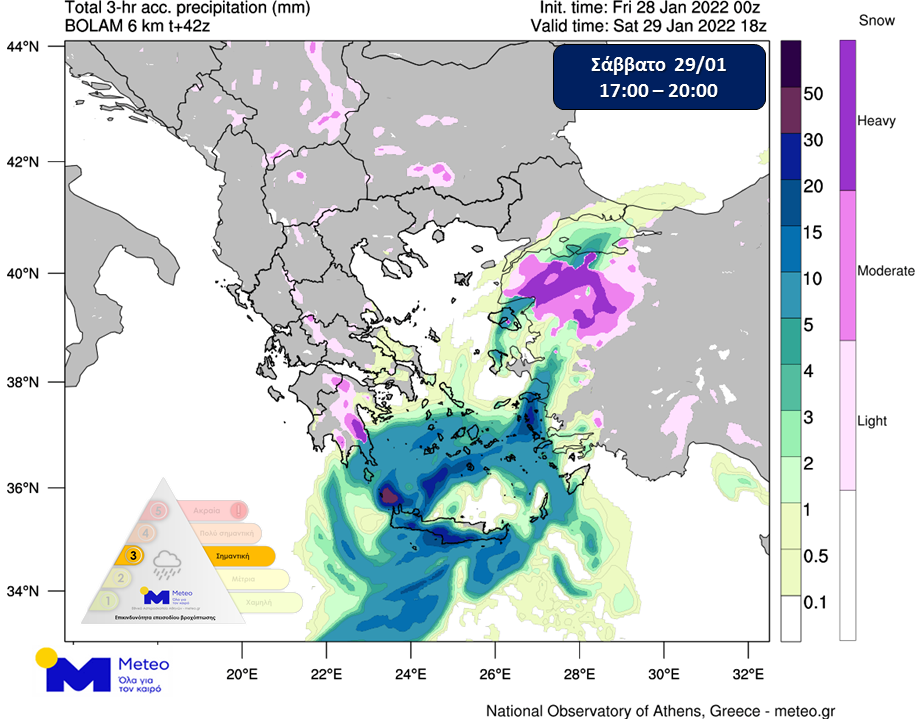 Σύμφωνα με τα προγνωστικά στοιχεία του Εθνικού Αστεροσκοπείου Αθηνών / Meteo.gr, κατά τη διάρκεια του Σαββατοκύριακου 29/01-30/01, οι βροχές και οι καταιγίδες στις Κυκλάδες, στην Κρήτη, στη Νότια Πελοπόννησο (το Σάββατο), στα νησιά του Ανατολικού Αιγαίου και στα Δωδεκάνησα θα είναι ισχυρές, ιδιαίτερα τις πρώτες πρωινές ώρες της Κυριακής 30/01, κατατάσσοντας την επερχόμενη κακοκαιρία στην κατηγορία 3 του Δείκτη Επικινδυνότητας Βροχόπτωσης (Regional Precipitation Index – RPI).
