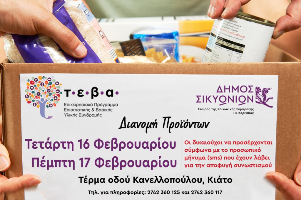 Ο Δήμος Σικυωνίων, στο πλαίσιο του προγράμματος «Επισιτιστικής και Βασικής Υλικής Συνδρομής του Ταμείου Ευρωπαϊκής Βοήθειας για τους Απόρους (ΤΕΒΑ/FEAD)», ενημερώνει ότι την Τετάρτη 16 και την Πέμπτη 17 Φεβρουαρίου 2022 θα πραγματοποιηθεί διανομή βασικών προϊόντων ΤΕΒΑ, που αφορά στην ενίσχυση 650 νοικοκυριών.