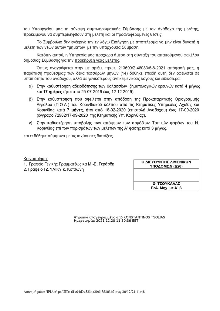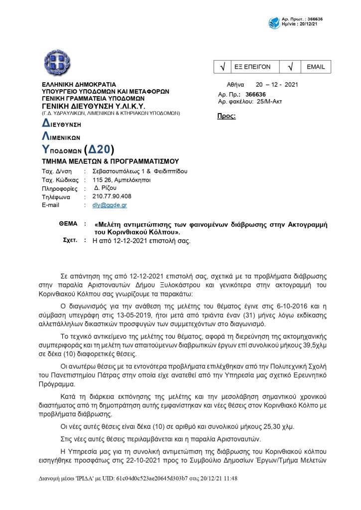 Στο ερώτημα αν έχει ενταχθεί η ακτή Αριστοναυτών στη συνολική μελέτη του Κορινθιακού Κόλπου, παραδέχθηκε ότι δεν είχε συμπεριληφθεί και ότι προτάθηκε από το Δήμο συμπληρωματικά!
