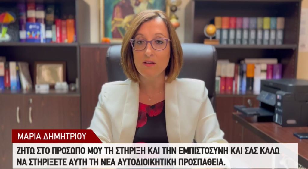 Με μια σύντομη δήλωση στα κοινωνικά δίκτυα και συγκεκριμένα στην σελίδα της στο Facebook η δικηγόρος Μαρία Δημητρίου ανακοίνωσε την υποψηφιότητά της για τον δημαρχιακό θώκο του δήμου Βέλου-Βόχας. Η ανεξάρτητη δημοτική σύμβουλος μιλά για ανατροπή στον τρόπο σκέψης, δράσης και αντίληψης, καθώς και για ρήξη με τη στασιμότητα και την αδράνεια. Μιλά για μία επανεκκίνηση με ανθρώπους νέους και άφθαρτους χωρίς σκιές και ερωτηματικά από το παρελθόν.
