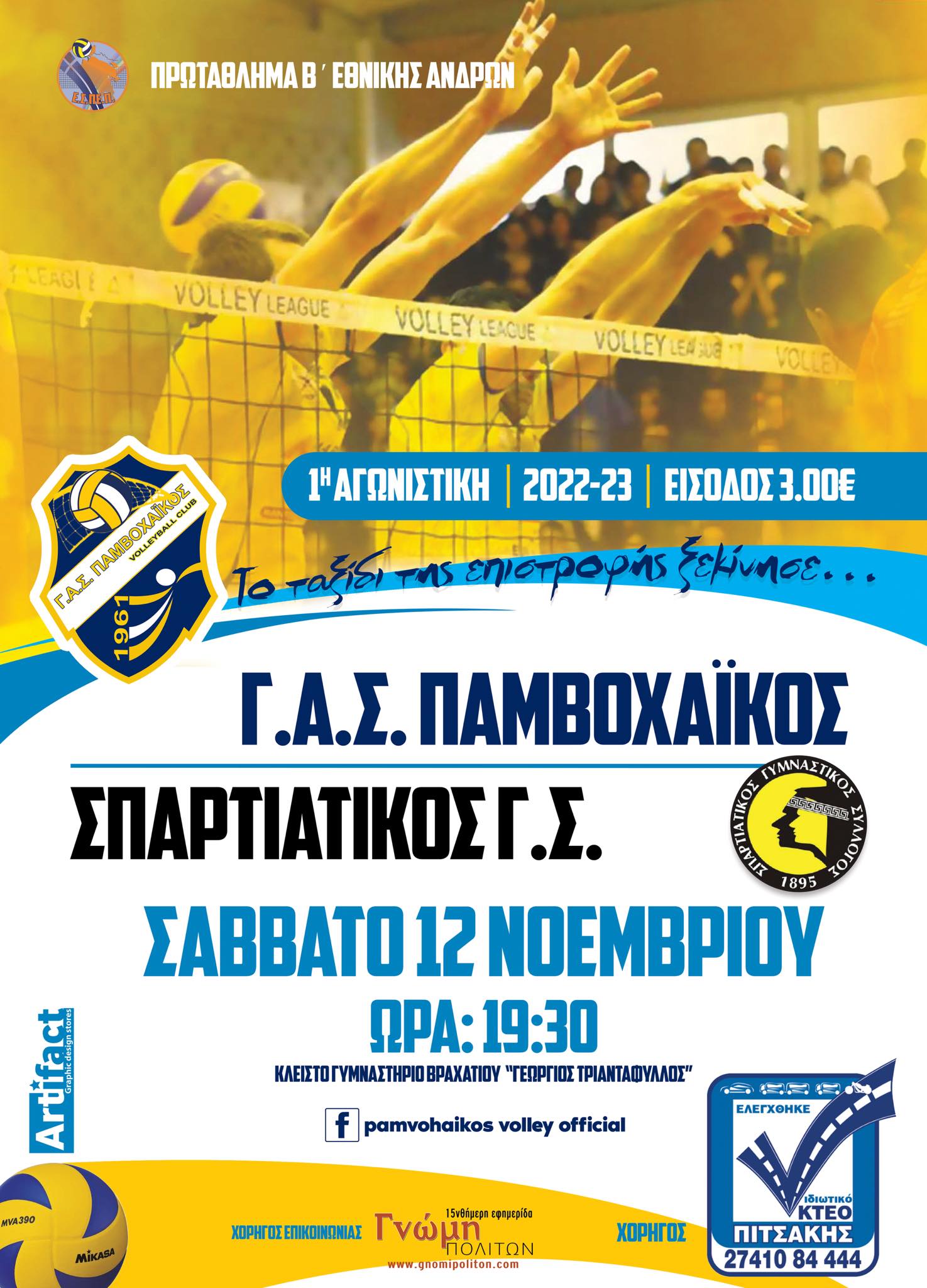 Τις υποχρεώσεις τους στο πρωτάθλημα της Β΄ εθνικής κατηγορίας ξεκινούν οι άνδρες του Παμβοχαϊκού το Σάββατο 12 Νοεμβρίου, στις 7:30 το απόγευμα, κόντρα στον Σπαρτιατικό.