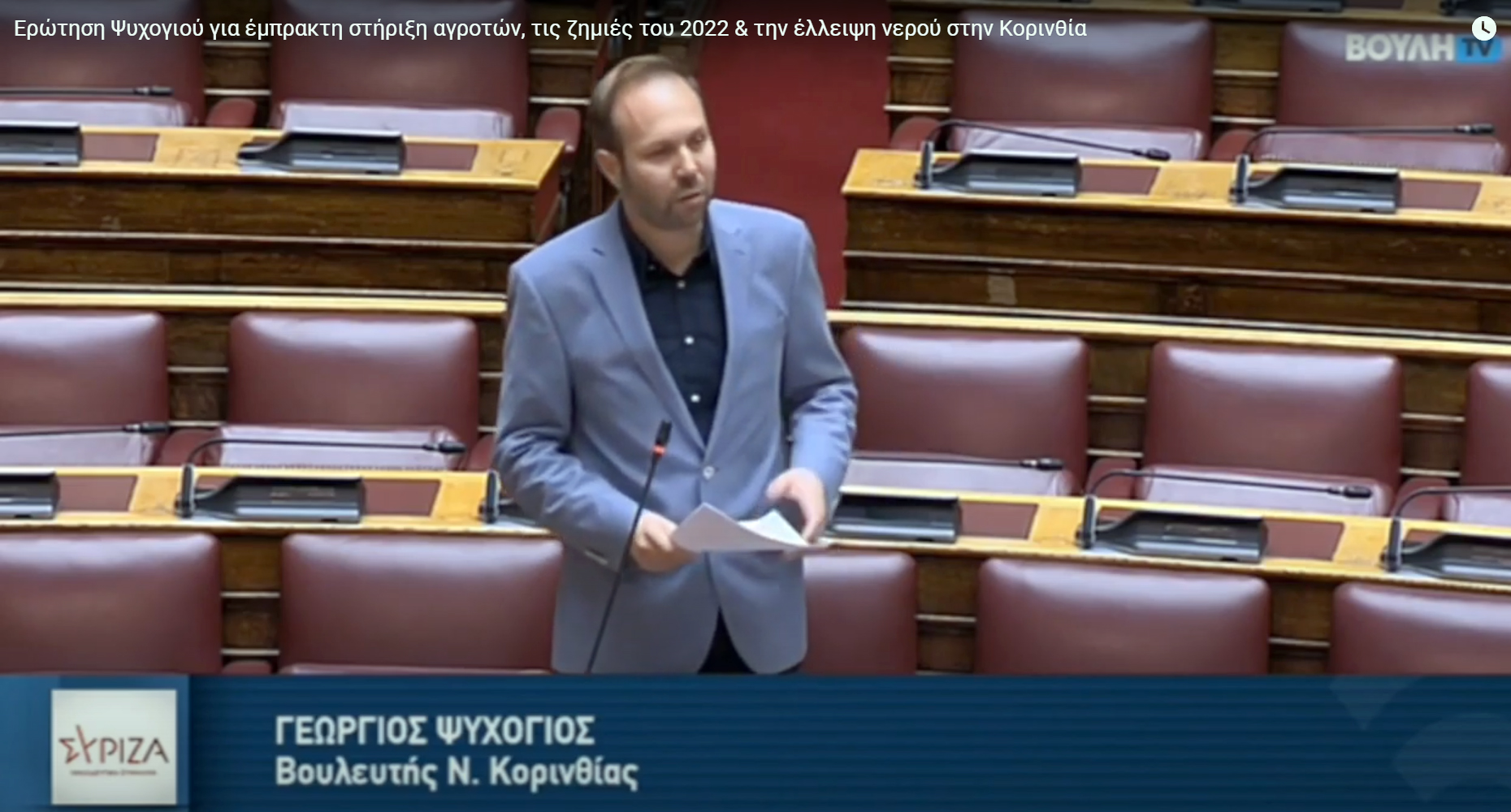 Συζητήθηκε χθες στη Βουλή, η Επίκαιρη Ερώτηση του κ. Γ. Ψυχογιού, βουλευτή Κορινθίας του ΣΥΡΙΖΑ-ΠΣ, προς τον Υπουργό Αγροτικής Ανάπτυξης και Τροφίμων σχετικά με την επείγουσα ανάγκη έμπρακτης στήριξης των παραγωγών της Κορινθίας για τις ζημιές του 2022 και 2021, αλλά και την δραματική έλλειψη νερού σε πολλές περιοχές του Νομού.