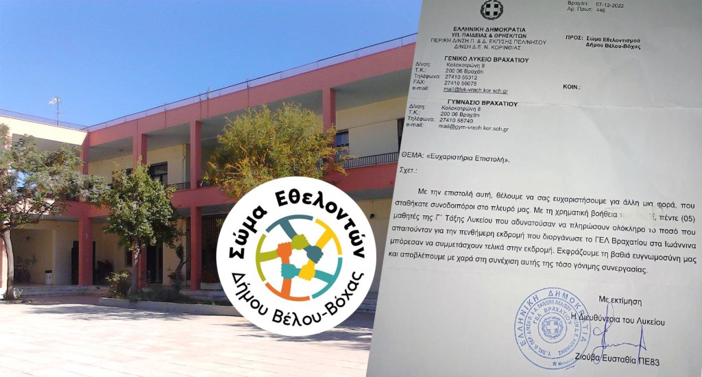 Μια πράξη αγάπης, λίγο πριν τις γιορτές, πραγματοποιήθηκε από το Σώμα Εθελοντών του Δήμου Βέλου-Βόχας. Η κίνηση, ευγενική και τρυφερή, αφορούσε στην χρηματική βοήθεια από πλευράς Σώματος Εθελοντών σε μαθητές του Λυκείου Βραχατίου ώστε να μπορέσουν να πραγματοποιήσουν την επιθυμία τους και να συμμετάσχουν στην πενθήμερη εκδρομή της Γ΄ Λυκείου.
